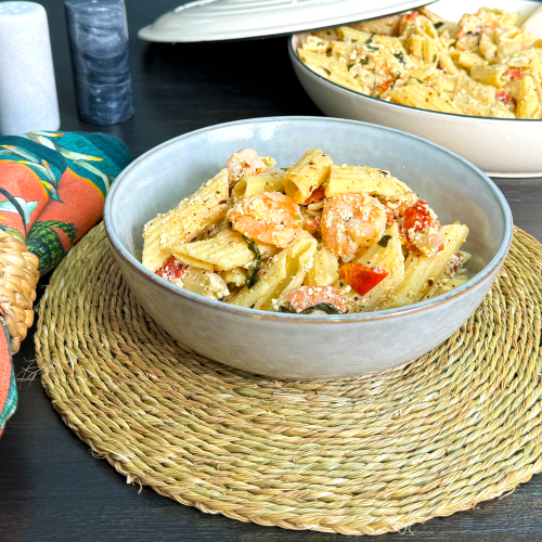 Baked tomato feta prawn pasta